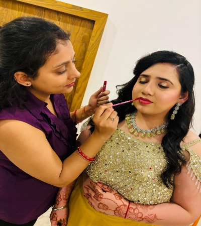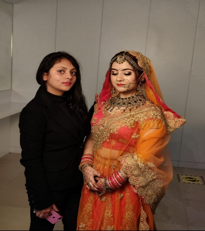 Her makeup skills are great..she does flawless makeup...one thing that sets her apart is that she does wait patiently for every product to get fully settled on your skin and it helps to get a clean look...and she takes full care of hygiene while doing makeup
